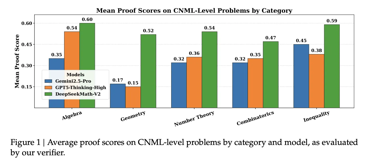 On an internal set of 91 CNML level problems covering algebra, geometry, number theory, combinatorics, and inequalities, it shows that DeepSeekMath-V2 achieves the highest mean proof score among Gemini 2.5 Pro, GPT 5 Thinking High, and DeepSeekMath-V2 in every category, as measured by their verifier.
