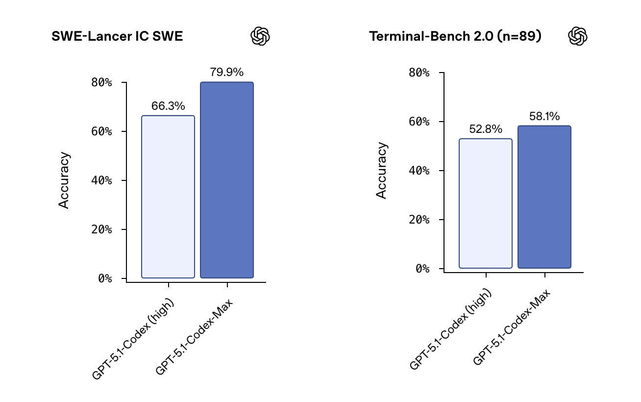 These changes show up in benchmark results. With GPT-5.1-Codex evaluated at high reasoning effort and GPT-5.1-Codex-Max at xhigh, OpenAI reports the following scores on 500 issues of SWE-bench Verified, 73.7% for GPT-5.1-Codex and 77.9% for GPT-5.1-Codex-Max. On SWE-Lancer IC SWE, the scores are 66.3% and 79.9%. On Terminal-Bench 2.0, scores are 52.8% and 58.1%. All evaluations run with compaction enabled, and Terminal-Bench 2.0 uses the Codex CLI inside the Laude Institute Harbor harness.